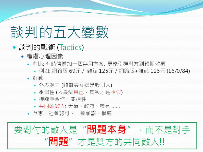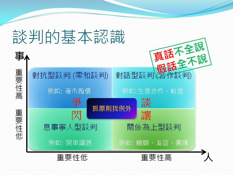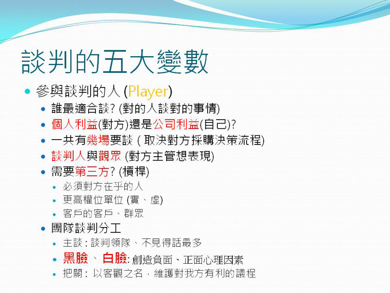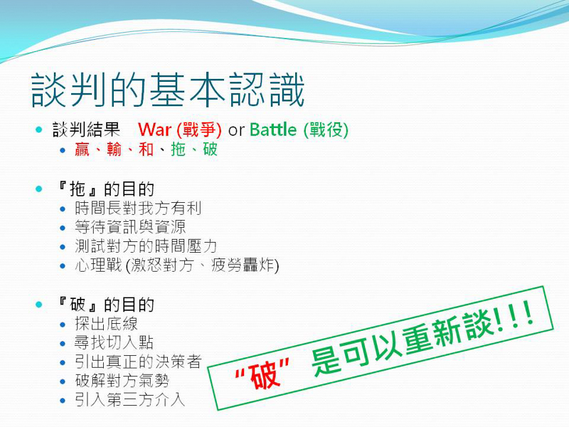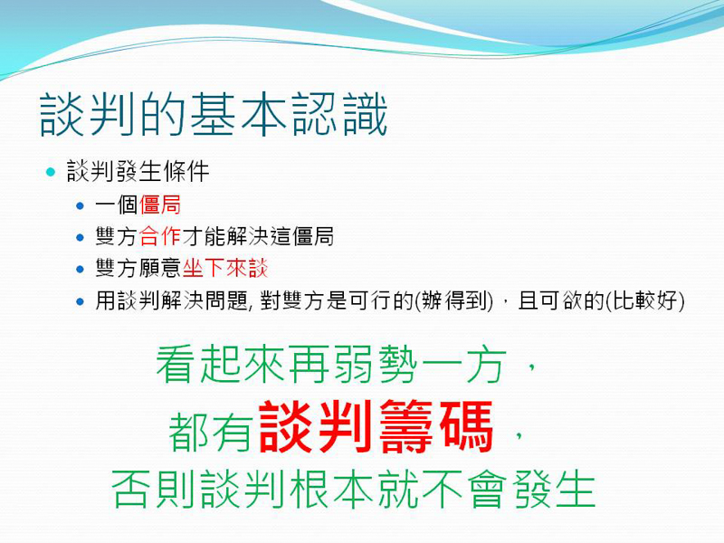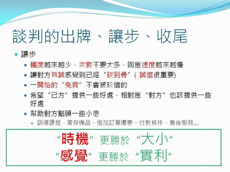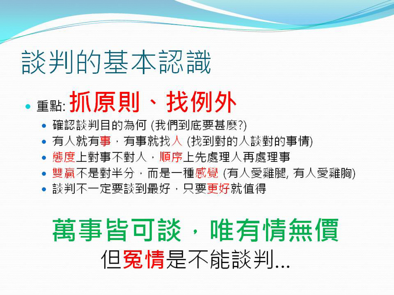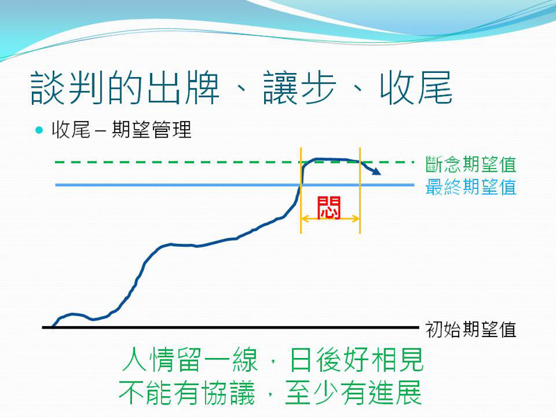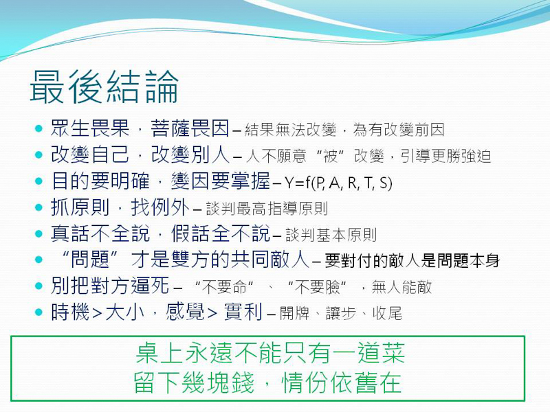 2015 領導統御課程 (IX) – 談判技巧 Post published:2015-11-14 Post category:課堂筆記 Post comments:0 Comments 人生無時無刻都在談判,小至夜市買東西、網路拍賣,大至企業併購、領土紛爭,沒有人可以避免。只有要人,只要有事,免不了談判。但大多數人都使用本能在談判,想用音量壓制對方,想用拳頭逼迫對方,最後造成非理性爭吵,甚至暴力相向,親家變冤家,友誼變仇敵,其實並不是很明智。 談判是有技巧的,這也是這次課程講師強調的重點。這次講師屬於理工背景,重邏輯分析,非常注重因跟果的對應。在上課實際練習中,一定會用條件式來帶出結果。許多學員詢問問題,他會先確認條件,並把條件環境限定住後,根據此情境說出他的答案。如果條件無法確定,他通常會通則或通例,後面外帶一個 ”不一定”。 「抓原則,找例外」,這是談判最高指導原則。要先弄清楚此次的談判目的,知道對方想要甚麼,評估談與不談的後果,找出對自己最佳形勢,運用最有利的規則,使用最有效的戰術,得到最接近理想的結果。談判不一定會得到自己想要的結果,但可以得到是較佳的結果。 「真話不全說,假話不必說」,這是談判基本原則。一個謊言需要十個謊言來彌補,而且總會有被戳破的一天。但可以針對事實部分,有條件的陳訴。再怎麼弱勢一方,都會有談判籌碼,所以一定要盡其所能尋找出自己的籌碼。無論再怎麼強勢,千萬別把對方逼死, ”不要臉” “不要命” 是無人能敵。要對付的敵人是 ”問題本身”,不是對方,要針對問題作解決。更重要,千萬別跟談判的標的物 ”談戀愛” ,會讓自己錯估形勢,喪失一切籌碼。 談判會陷入僵局,很多時候是 ”立場” 堅持,如果能轉換成 ”利益” 通常能尋找出各自的利基點,而求得雙贏局面。要根據自己的策略,決定出牌方式。讓步要讓對方有真正的感受到 ”見骨” 的快感,”免費” 不會被珍惜的,讓對方出盡全力,”好處” 才會被珍惜。”時機” 更勝於 ”大小”,”感覺” 更勝於 ”實利”。 這課程上到最後,有一句話相當不錯:「桌上永遠不能只有一道菜;留下幾塊錢,情份依舊在」很多人總是想把所有好處全拿,卻不知不覺把自己後路斷絕。真正談判高手好處不會全拿,適當時機也會留給對方一些好處,保留對方面子,也是為下一場談判打下基礎。人生在世,又有誰能得意一輩子? 也許這次留手,會是下一次的籌碼。 露出深思的酸秀才留 憂鬱酸秀才 腰繫半瓶酸酒, 嘴唱半掉書袋, 肩背兩光步槍, 手揮一招半式, 腳踏半調步伐, 醉闖江湖天下。 You Might Also Like 2015 領導統御課程 (VIII) – 溝通協調&跨部門合作與衝突管理 (補充) 2015-10-26 2015 領導統御課程 (VIII) – 溝通協調 & 跨部門合作與衝突管理 2015-10-26 2015 研發人員的設計思考 – 讓創意變黃金 一些想法 2015-05-09 發佈留言 取消回覆CommentEnter your name or username to comment Enter your email address to comment Enter your website URL (optional) The reCAPTCHA verification period has expired. Please reload the page. Δ
