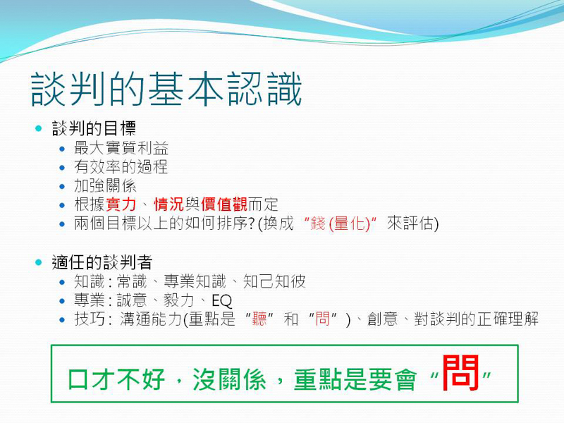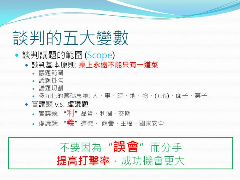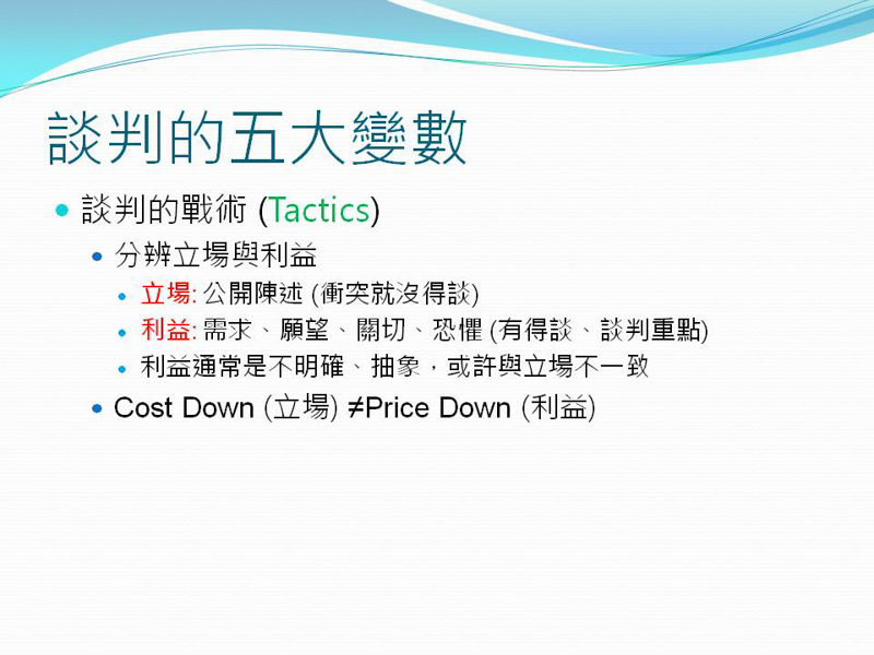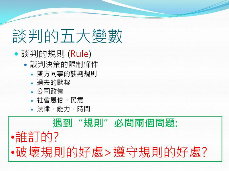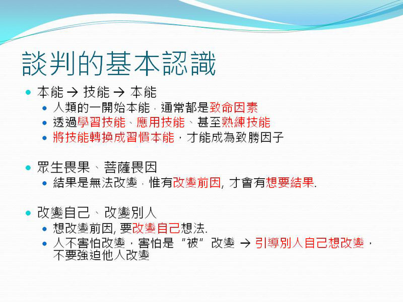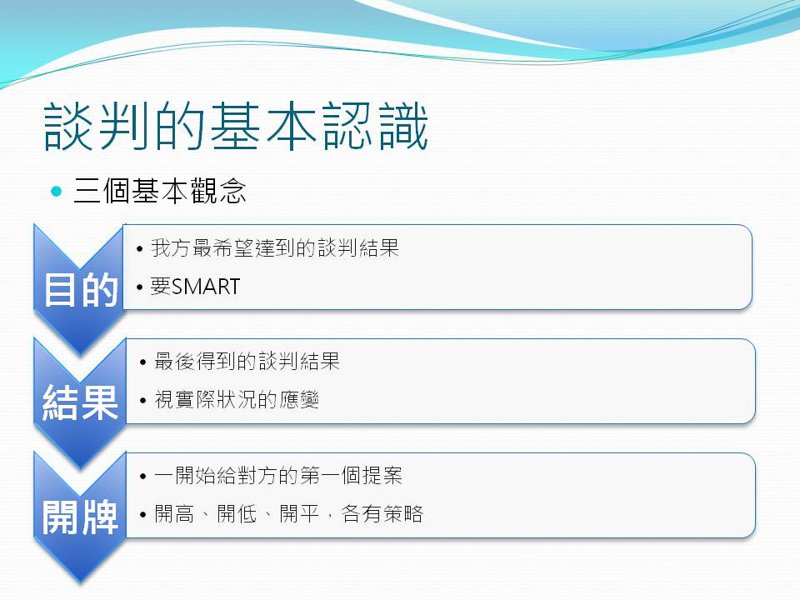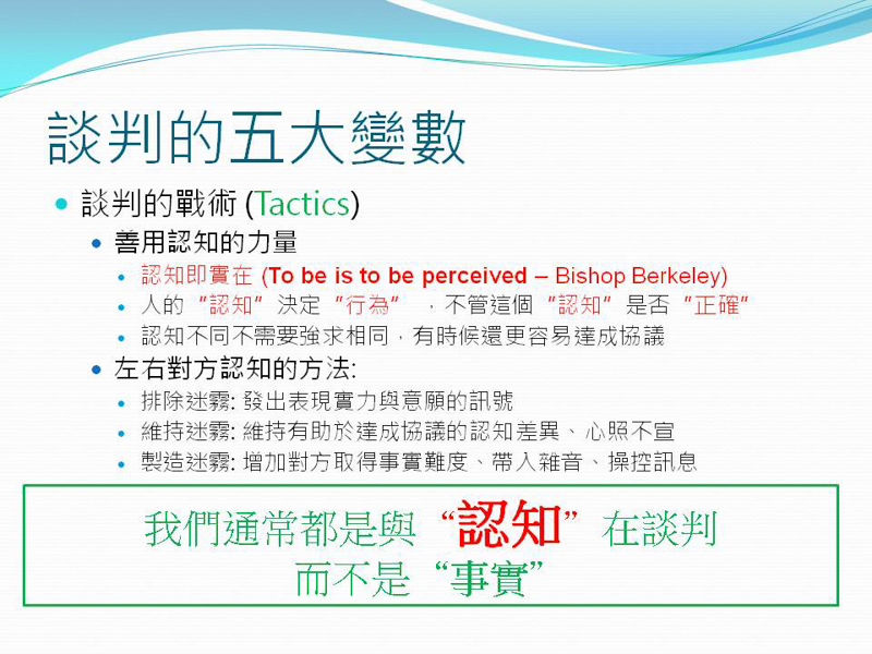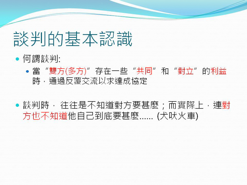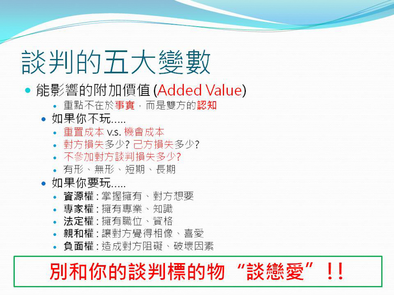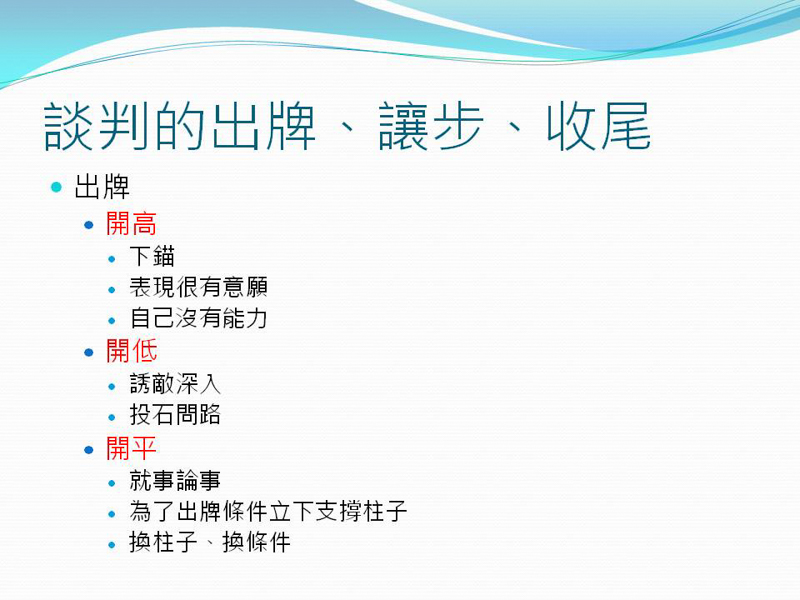 2015 領導統御課程 (IX) – 談判技巧 Post published:2015-11-14 Post category:課堂筆記 Post comments:0 Comments 人生無時無刻都在談判,小至夜市買東西、網路拍賣,大至企業併購、領土紛爭,沒有人可以避免。只有要人,只要有事,免不了談判。但大多數人都使用本能在談判,想用音量壓制對方,想用拳頭逼迫對方,最後造成非理性爭吵,甚至暴力相向,親家變冤家,友誼變仇敵,其實並不是很明智。 談判是有技巧的,這也是這次課程講師強調的重點。這次講師屬於理工背景,重邏輯分析,非常注重因跟果的對應。在上課實際練習中,一定會用條件式來帶出結果。許多學員詢問問題,他會先確認條件,並把條件環境限定住後,根據此情境說出他的答案。如果條件無法確定,他通常會通則或通例,後面外帶一個 ”不一定”。 「抓原則,找例外」,這是談判最高指導原則。要先弄清楚此次的談判目的,知道對方想要甚麼,評估談與不談的後果,找出對自己最佳形勢,運用最有利的規則,使用最有效的戰術,得到最接近理想的結果。談判不一定會得到自己想要的結果,但可以得到是較佳的結果。 「真話不全說,假話不必說」,這是談判基本原則。一個謊言需要十個謊言來彌補,而且總會有被戳破的一天。但可以針對事實部分,有條件的陳訴。再怎麼弱勢一方,都會有談判籌碼,所以一定要盡其所能尋找出自己的籌碼。無論再怎麼強勢,千萬別把對方逼死, ”不要臉” “不要命” 是無人能敵。要對付的敵人是 ”問題本身”,不是對方,要針對問題作解決。更重要,千萬別跟談判的標的物 ”談戀愛” ,會讓自己錯估形勢,喪失一切籌碼。 談判會陷入僵局,很多時候是 ”立場” 堅持,如果能轉換成 ”利益” 通常能尋找出各自的利基點,而求得雙贏局面。要根據自己的策略,決定出牌方式。讓步要讓對方有真正的感受到 ”見骨” 的快感,”免費” 不會被珍惜的,讓對方出盡全力,”好處” 才會被珍惜。”時機” 更勝於 ”大小”,”感覺” 更勝於 ”實利”。 這課程上到最後,有一句話相當不錯:「桌上永遠不能只有一道菜;留下幾塊錢,情份依舊在」很多人總是想把所有好處全拿,卻不知不覺把自己後路斷絕。真正談判高手好處不會全拿,適當時機也會留給對方一些好處,保留對方面子,也是為下一場談判打下基礎。人生在世,又有誰能得意一輩子? 也許這次留手,會是下一次的籌碼。 露出深思的酸秀才留 憂鬱酸秀才 腰繫半瓶酸酒, 嘴唱半掉書袋, 肩背兩光步槍, 手揮一招半式, 腳踏半調步伐, 醉闖江湖天下。 You Might Also Like 2015 領導統御課程 (VIII) – 溝通協調&跨部門合作與衝突管理 (補充) 2015-10-26 2015 領導統御課程 (VIII) – 溝通協調 & 跨部門合作與衝突管理 2015-10-26 2015 研發人員的設計思考 – 讓創意變黃金 一些想法 2015-05-09 發佈留言 取消回覆CommentEnter your name or username to comment Enter your email address to comment Enter your website URL (optional) The reCAPTCHA verification period has expired. Please reload the page. Δ